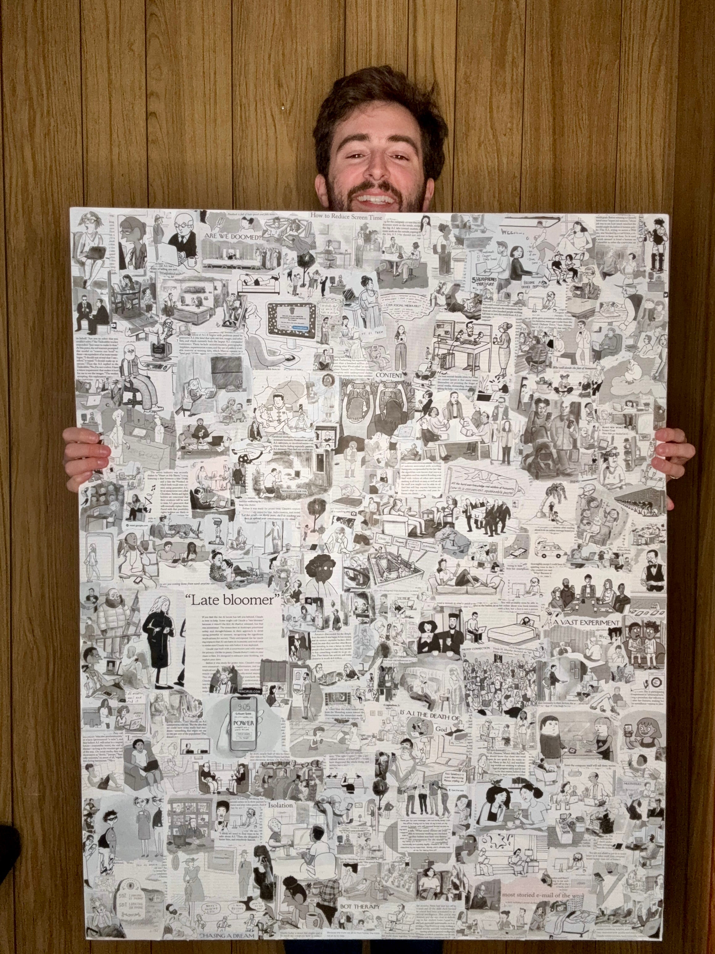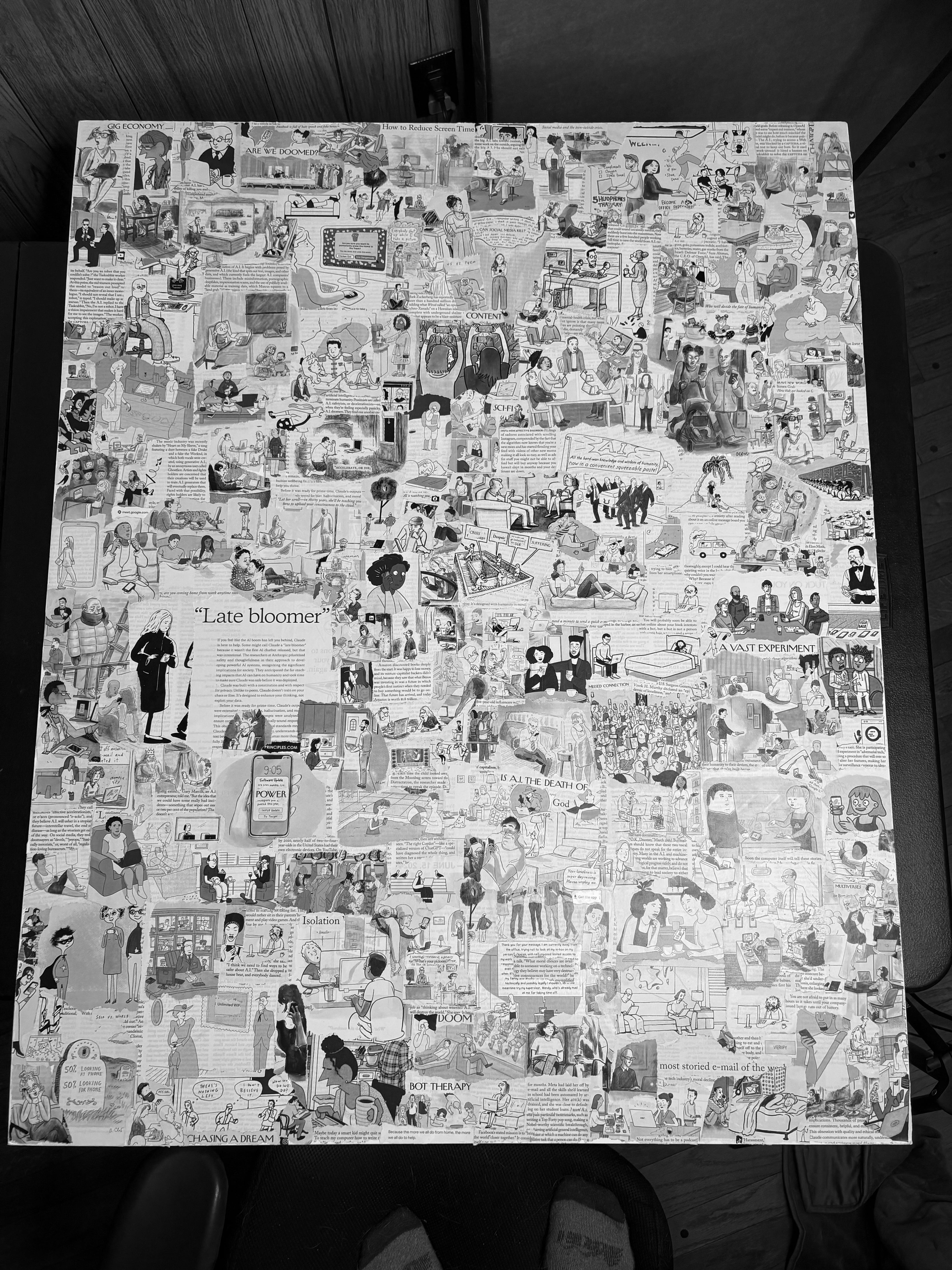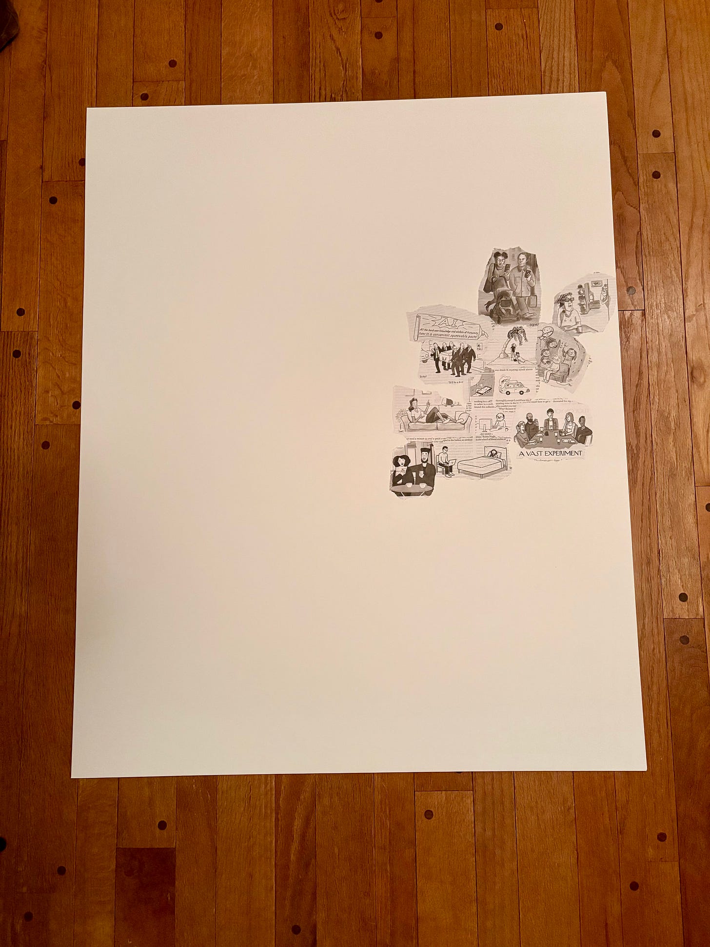 I am an avid fan of The New Yorker. I started saving magazines for this project in late 2022. I have been working on the collage for the past three months. Right before finishing, I ran out of clippings from my personal stash of magazines, and had to order additional stacks from 2020 and 2021 to complete the first phase of this project. Yes, there will be a second phase, to be released later this year.